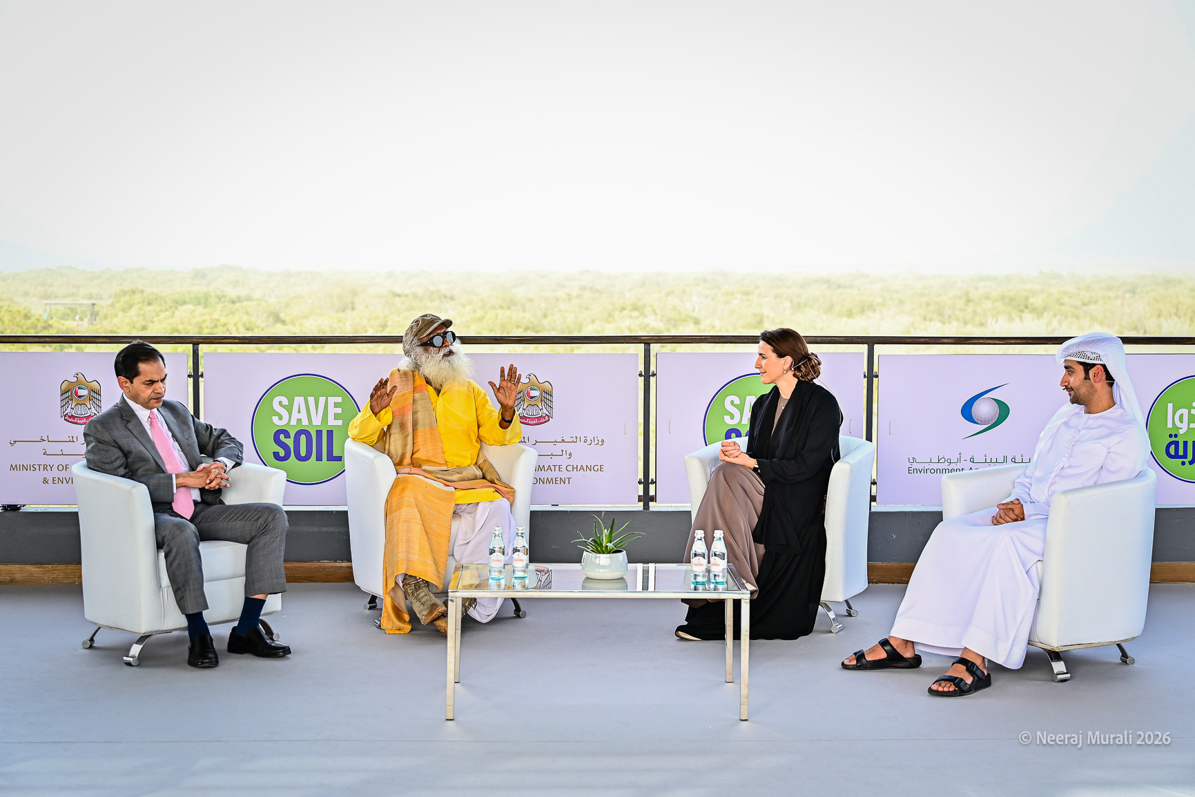 From left, Sunjay Sudhir, Ambassador of India to the UAE; Sadhguru, founder of Conscious Planet; Mariam bint Mohammed Almheiri, Minister of Climate Change and Environment; and Ahmed Al Hashmi of the Environment Agency Abu Dhabi interact at Jubail Island ahead of the signing of a MoU in Abu Dhabi, United Arab Emirates.